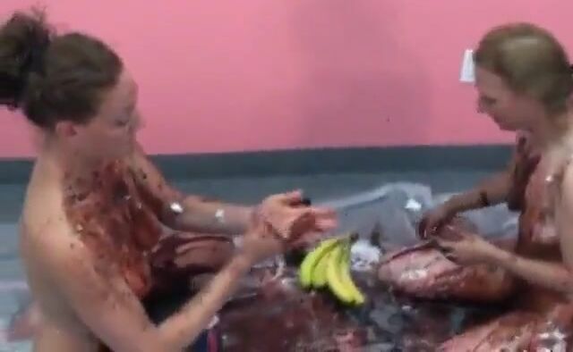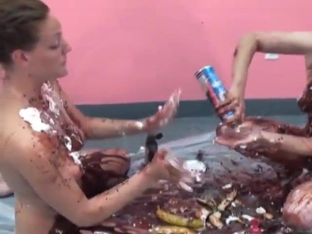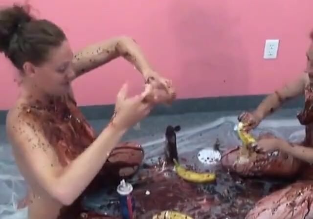 . Lustful chicks cover each other's naked bodies with desserts on the floor